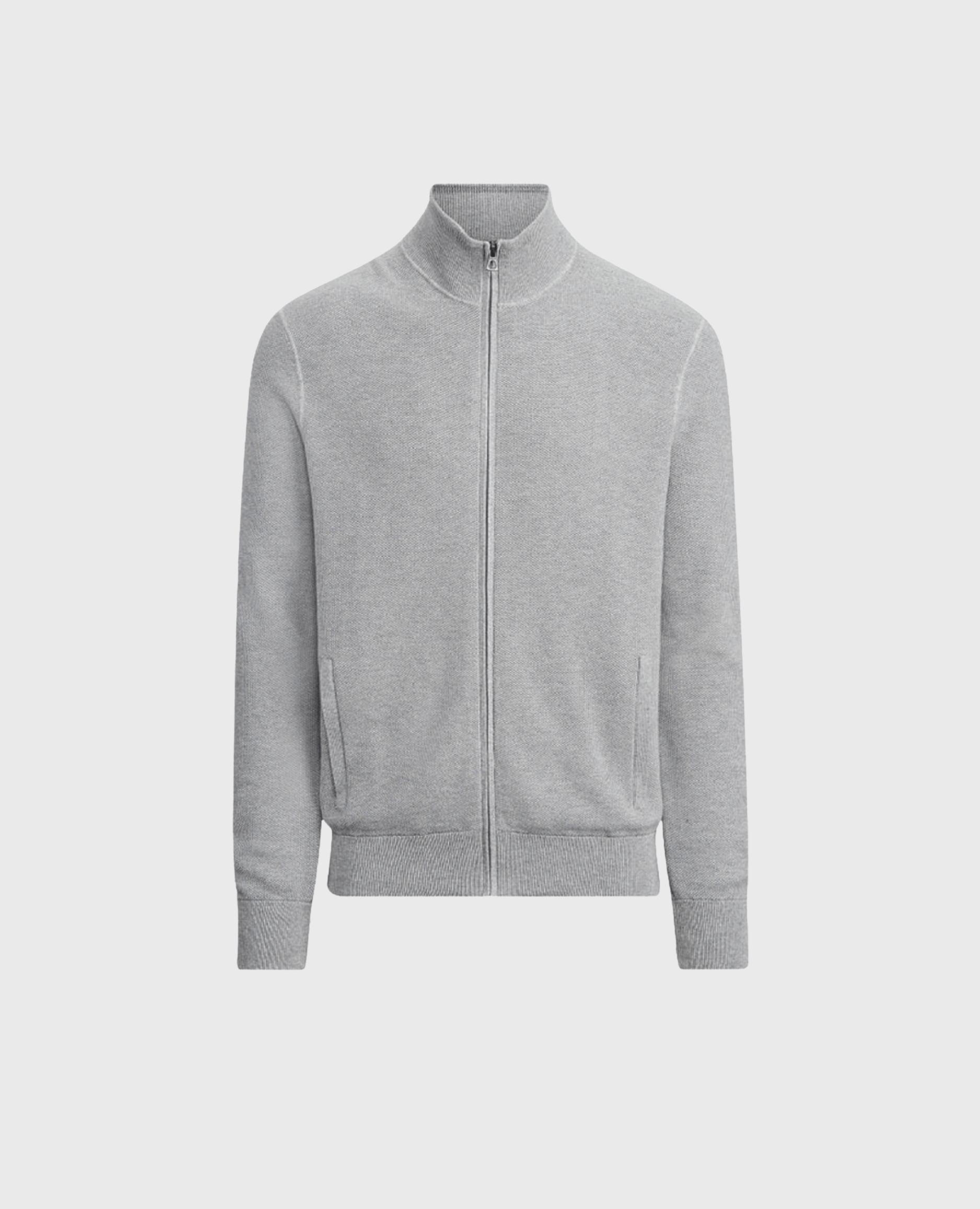 Grå cardigan med dragkedja. Den har en smal passform och är tillverkad av 100% bomull, vilket gör den både bekväm och andningsbar.